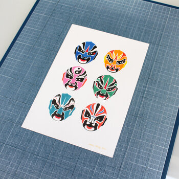 „Chinesische Theater- oder Opernmasken“ ist eine mit Buntstiften (Faber Castell Polychromos) auf 200 g/m² schwerem A4-Papier gezeichnete Illustration, die von chinesischen Opernmasken inspiriert ist. Diese Masken symbolisieren die Charakterzüge der Figuren in Opernstücken. Die Farben der chinesischen Opernmasken bringen die moralischen Qualitäten und das Schicksal der Figuren zum Ausdruck. Rot steht für Loyalität oder Tapferkeit, Schwarz für Integrität… usw. Diese Definitionen vervollständigen die Erzählung und begleiten die Wahrnehmung des Stücks durch das Publikum. Die Zeichnungen und Muster sind auch eine Möglichkeit, die Komplexität der Show zu vermitteln und gleichzeitig chinesische philosophische Konzepte wie Yin und Yang zu integrieren. Es war ein schöner Moment grafischer Untersuchung, diese Eigenschaften und Symbolik aufzugreifen und eine Serie von 6 Masken nachzubilden.