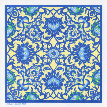 „Damaskus-Schriftrollen“ ist eine Illustration, die mit Farbstiften (Faber-Castell Polychromos) auf 20x20 cm großem Papier entstanden ist. Inspiriert wurde sie von Fliesen aus dem 16. Jahrhundert mit Rankenornamenten aus Damaskus, Syrien, die im Museum des Instituto Arabe (Paris, Frankreich) ausgestellt sind. In dieser Arbeit wollte ich die Finesse, Harmonie und den Reichtum orientalischer Motive sowohl technisch als auch grafisch erkunden. Jedes… florale Detail evoziert eine uralte Poesie, einen Tanz des Lichts und des Lebens. Dieses Werk lädt zur Kontemplation und zu einer Reise in das Herz erlesener Traditionen ein.