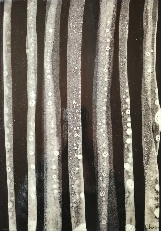 Mit dem Pinsel gemalte Linien auf schwarzem Papier, auf Leinwand aufgezogen und lackiert. Diese Linien erinnern an Baumstämme am Rande eines dunklen Waldes. Der Hintergrund ist im Stil asiatischen Lacks gehalten, glänzend und tief.