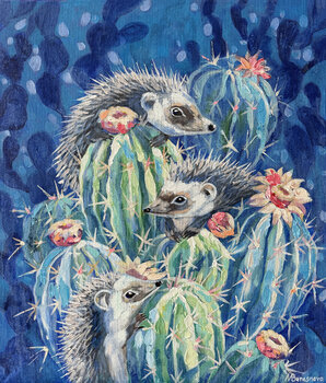 Das Gemälde zeigt drei Igel, die auf Kakteen sitzen. Es war, als hätten sie in ihrer Bewegung angehalten, um darüber nachzudenken, warum sie unter den stacheligen Nadeln litten. Es gibt einen bekannten Ausdruck: „Sie stachen, aßen aber weiterhin Kakteen“, der auf unglaubliche Ausdauer und Beharrlichkeit bei der Überwindung von Schwierigkeiten hinweist. Es ist jedoch nicht immer notwendig, extreme Maßnahmen zu ergreifen und bei der Verfolgung eines…