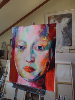 Mit Acrylfarben habe ich Seelenlinien gezeichnet und das Figurative mit dem Halbabstrakten verbunden. Das menschliche Wesen fließt in das Werk ein; Lebendige Farben, die Emotionen zum Leben erwecken, und ein Look, der tiefe Gedanken widerspiegelt. Ich fange das innere Licht, die Wärme des Lebens ein und bringe Energie und Leidenschaft in jeden Raum. Dies ist eine Feier der Menschheit und ihres emotionalen Spektrums.