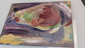 Eine Miniaturmalerei mit einer Birne in tiefen Burgunder- und hellgrünen Tönen, ausgeführt in der Impasto-Technik mit ausdrucksstarker Pinselfaktur, nach dem Leben gemalt.