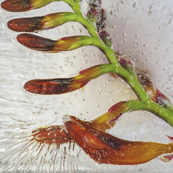 Für mich ist Fotografie ein Prozess, der ein Fenster in eine andere Welt öffnen kann. Ich bin auf Makrofotografie botanischer Motive spezialisiert. Ich mache jedoch keine wissenschaftlich korrekten Bilder. Ich verwende frisches Material aus meinem Garten und friere die Motive in deionisiertem Wasser in Petrischalen oder großen Eiswürfelschalen ein. In gewissem Sinne ist dieser Prozess ein buchstäbliches Einfrieren der Zeit, analog zur Fotografie selbst. Statt gestochen scharfe Bilder zu produzieren, verwende ich Eis, um visuelle Barrieren zu schaffen, durch Blasen, Risse und Verzerrungen, um ein Gefühl von überirdischem Mysterium zu erzeugen. Der Betrachter muss sich mehr anstrengen, um vertraute Pflanzenformen zu „lesen“, was den Akt des Sehens bewusster und gezielter macht. Ich beginne gerade, das Mischen von deionisiertem Wasser mit Leitungswasser in unterschiedlichen Anteilen zu erforschen und wie sich dies darauf auswirkt, was enthüllt und was verborgen wird.