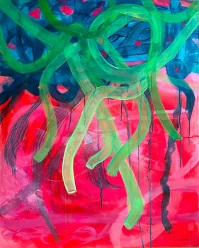 In diesem Werk habe ich mit Acryl lebendige, ineinander verschlungene Linien geschaffen, die jene Bänder symbolisieren, die in unserem Innersten hängen und verweilen, bis wir die Antworten finden, die wir für unsere Entwicklung brauchen; Gedanken auf der Suche nach Antworten, gefangen in einem emotionalen Wirbelsturm. Ich wollte, dass Sie die intensive und widersprüchliche Energie spüren, aber auch einen Schimmer von Möglichkeiten, der die Seele… erleuchtet. Dieses Werk wird Ihren Raum mit Dynamik und emotionaler Tiefe erfüllen, die zum ständigen Nachdenken einlädt.