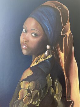 Obwohl es sich um die Nachbildung eines bekannten Werks handelt, betont diese junge Frau in diesem exotischen Outfit ihre schwarze Hautfarbe im Gegensatz zu einer Kleidung, die nicht zu ihrem Wesen und ihrer Identität passt. Das Outfit und der Schal deuten auf eine Mischung verschiedener Traditionen hin. Hier fange ich seine wahre Schönheit hinter einem Juwel ein, das versucht, die Aufmerksamkeit… des Betrachters auf sich zu ziehen: Ich lenke mit einem Juwel von der wahren Schönheit ab, die ich repräsentiere: Das Juwel bin ich!