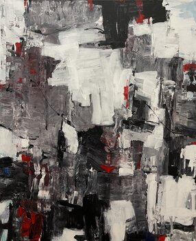 Meine Arbeit ist eine abstrakte Interpretation des ständigen Wandels und Flusses des Lebens, festgehalten in Acryl. Ich habe kräftige Pinselstriche und eine kontrastierende Palette aus Grau-, Schwarz- und Rottönen verwendet, um die Intensität und Leidenschaft hervorzurufen, die unsere persönlichen Reisen oft begleiten. Jeder Strich und jede Farbe drückt ein Gefühl oder einen Moment aus und liest sich wie ein visuelles Tagebuch menschlicher Erfahrungen,… das die Schönheit der Vergänglichkeit und des Chaos widerspiegelt. Dieses Stück soll eine emotionale Resonanz hervorrufen und jedem Raum, in dem es sich befindet, Tiefe und Gesprächsstoff verleihen. Wenn ich mit Abstraktion arbeite, verwende ich Spachtel und verschiedene Werkzeuge, mit denen ich Texturen erstellen und mit Farben mischen kann, sodass verborgene Geheimnisse fast ohne Nachdenken zum Vorschein kommen. Warum schwarz und weiß? Das Gute, das Schlechte, das Schöne und das Hässliche, die Kontraste, und das ist das Leben!