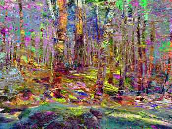 In diesem digitalen Foto habe ich die ruhige Waldszene mit lebendigen, surrealen Farben versehen, um ein Gefühl von Wunder und Zauber hervorzurufen. Die Gegenüberstellung von feurigem Rot und kühlem Lila verwandelt den Alltag in eine fantastische Flucht und fängt das magische Zusammenspiel von Licht und Natur ein. Dieses Kunstwerk verleiht jedem Raum eine energetische und fantasievolle Präsenz und lädt den Betrachter ein, sich in einer lebendigen,… traumhaften Welt zu verlieren.