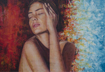 Dieses Werk entstand aus einem tiefen Moment der Selbstreflexion und inneren Ruhe. Ich wollte die Zartheit und Kraft des Schließens der Augen und der Verbindung mit sich selbst einfangen und nutzte dafür die reiche Textur von Acryl, Öl, Wachs und Marmorstaub. Jeder warme und kühle Ton spiegelt die innere Dualität wider und erfüllt den Raum mit Ruhe und emotionaler Energie – ideal, um Sie an die Bedeutung innerer Stille in Ihrem Zuhause zu erinnern.