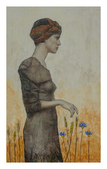 In diesem Werk wollte ich die Ruhe und innere Stärke der weiblichen Figur einfangen, umgeben von der Zerbrechlichkeit und Hoffnung, die die Weizenblüten und das intensive Blau symbolisieren. Die Lithografie ermöglichte es mir, dem Papier Struktur und Tiefe zu verleihen und so eine intime und besinnliche Atmosphäre zu schaffen. Dieses Werk lädt uns ein, die Ruhe und Schönheit zu entdecken, die sich manchmal in der Einfachheit verbergen.