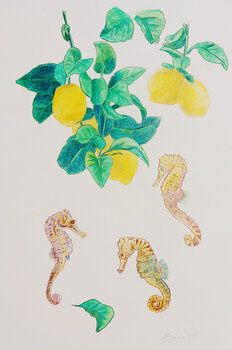 In diesem Werk habe ich die Frische von Zitronen mit der Anmut von Seepferdchen kombiniert, um eine surreale Verbindung zwischen Land und Meer zu schaffen. Mit farbigen Buntstiften wollte ich die Lebendigkeit und Zerbrechlichkeit des Lebens zeigen. Die Symbolik lädt ein, die Freude an unerwarteten Begegnungen zu spüren, die Energie und Frische in jeden Raum bringen.