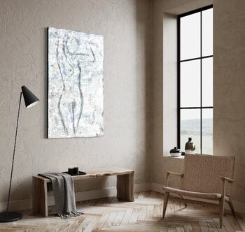 In diesem Stück habe ich Öl und Kohle miteinander vermischt, um die rohe, emotionale Essenz der menschlichen Form und des menschlichen Geistes zu erkunden. Der minimalistische Ansatz beseitigt das Durcheinander und konzentriert sich auf die Reinheit und Verletzlichkeit der Figur. Die Striche sind sowohl sanft als auch chaotisch und fangen ein Spektrum menschlicher Emotionen ein. Es ist eine Einladung, über Einfachheit und Tiefe nachzudenken und bringt… eine heitere und doch provokative Energie in jeden Raum, den es bewohnt.