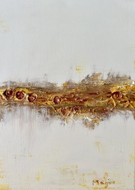 In dieser intimen Arbeit erforsche ich die Schönheit des Verborgenen. Mit einer Gesso-Grundierung forme ich das Relief und verwende Acrylfarben, um die erdigen und metallischen Töne hervorzuheben. Das Werk zeichnet sich durch ein zentrales Band aus, das an eine Mineralader oder eine geologische Schicht erinnert.