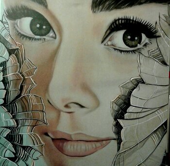 In dieser Übermalung wollte ich die ikonische Anmut bewahren und zugleich aufbrechen. Ich habe die glatte Oberfläche des Gesichts bewusst kontrastiert mit der Struktur und Bewegung der Linien, die sich wie zarte Schichten einer anderen Realität um die Konturen legen. So entsteht eine Verbindung von zeitloser Eleganz und moderner Fragmentierung – als würde das Bekannte sich neu erfinden. Mit jeder Schicht wollte ich der Stille des Gesichts eine zusätzliche… Dimension verleihen: Tiefe, Fragilität und die Ahnung von Veränderung.