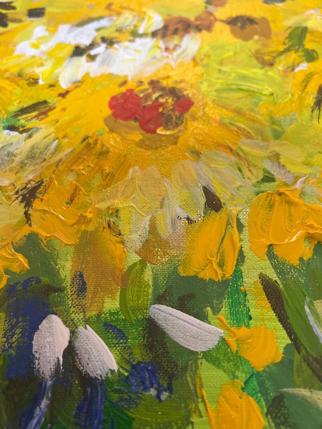 Ich habe „Blumen der Hoffnung“ (Acryl auf Leinwand, 100 x 100 cm, 2024) vor etwa zwei Jahren gemalt und bin dieses Jahr mitten im Krieg zurückgekehrt, um es fertigzustellen. Die gelben Sonnenblumen symbolisieren Hoffnung, Wärme und israelische Identität. Ich hoffe, dass dieses Kunstwerk uns daran erinnern kann, dass Hoffnung selbst in den dunkelsten Zeiten wertvoll ist und wir die Bedeutung des Mitgefühls für unsere Mitmenschen nicht vergessen dürfen.… Wir hoffen auf eine baldige Rückkehr der Gefangenen und auf wahren Frieden für alle auf allen Seiten des Konflikts.