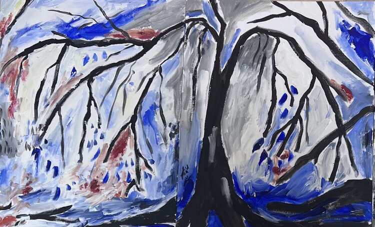 In diesem Acrylgemälde habe ich das Zusammenspiel von Widerstandskraft und Verletzlichkeit verkörpert, wobei die Natur menschliche Emotionen widerspiegelt. Die starken, kräftigen Linien des Baumes vor einem stürmischen Himmel vermitteln ein Gefühl von Stärke und Ausdauer. Die roten Akzente inmitten der überwältigenden Blautöne symbolisieren flüchtige Momente der Leidenschaft und des Schmerzes. Dieses Stück lädt zur Kontemplation und Selbstbetrachtung… ein und bringt eine dynamische und nachdenkliche Energie in jeden Raum.
