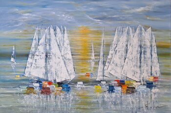 Ich habe dieses Kunstwerk geschaffen, um die sanfte Schönheit eines Segeltörns im Sonnenuntergang einzufangen. Impressionismus und Abstraktion verschmelzen zu einem lebendigen Ganzen und erzeugen so ein Gefühl von Bewegung und Licht. Die weißen Segel erwachen auf dem ruhigen Wasser zum Leben und verleihen Ihrem Raum eine lebendige Ruhe und wohltuende Energie, die zum Träumen und Entspannen einlädt.