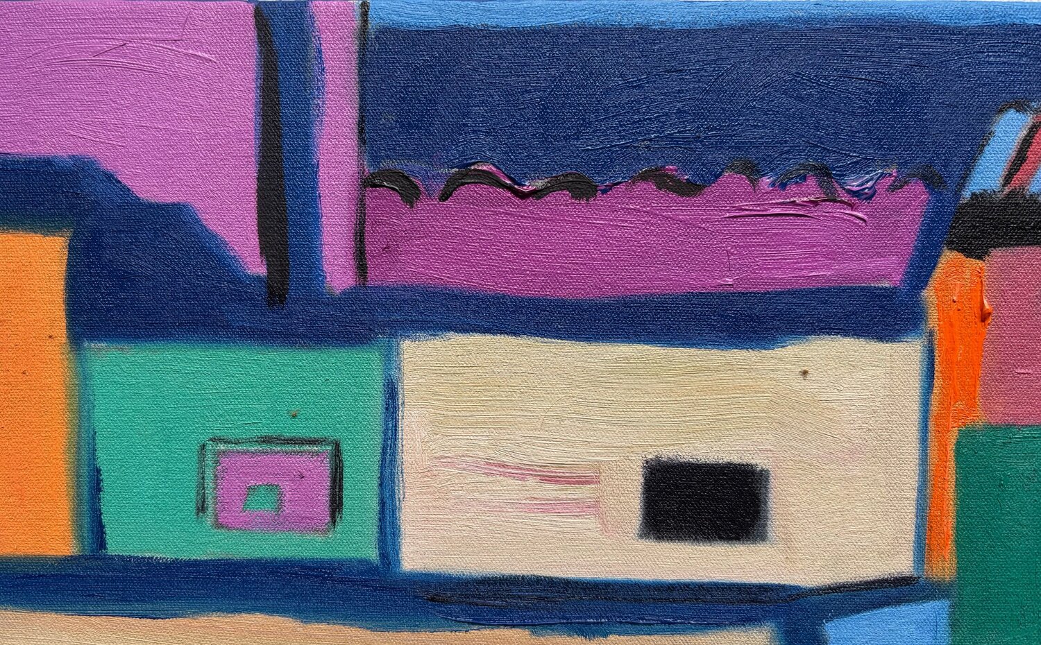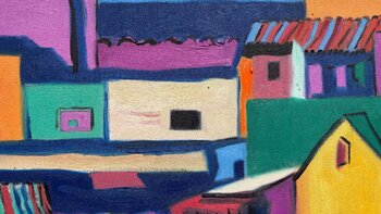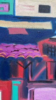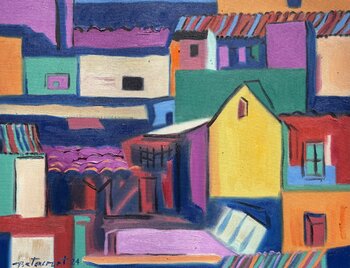 Hierbei handelt es sich um ein mit Komplementärfarben gearbeitetes Werk, das Thema… ist jedoch auf einen Weiler in den Anden beschränkt, in dem die nüchternen geometrischen Räume mit geometrischem Stil mit denen der wellenförmigen Dächer der Dörfer kombiniert werden. Die Farben fallen durch den starken Kontrast, aber auch durch die dunkelblauen Ränder auf. Man kann auch sagen, dass diese Farben von Textilien der Aborigines inspiriert sind.