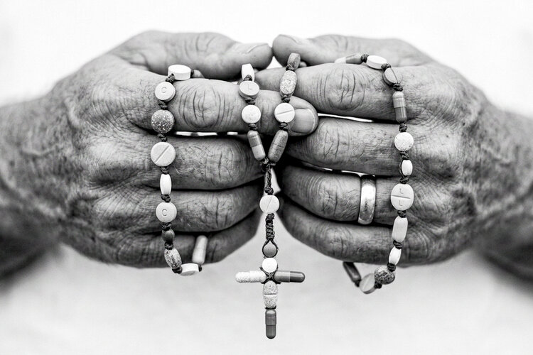 In dieser digitalen Arbeit wollte ich die Stärke und Zerbrechlichkeit des Menschen durch die Symbolik des aus Pillen gefertigten Rosenkranzes einfangen.