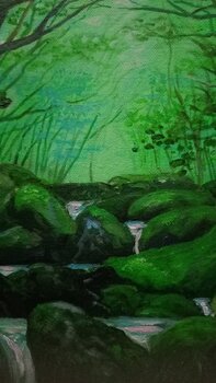 Ich habe dieses Werk mit einer beruhigenden Energie geschaffen und die sanfte Melodie des Wassers eingefangen, das zwischen den Felsen fließt. Durch diesen Realismus wollte ich die Ruhe und Hoffnung vermitteln, die die Natur schenkt, wenn man unter dem Blätterdach des Grüns entlang des Wasserfalls wandert. Das Grün des Ortes wirkt wohltuend.