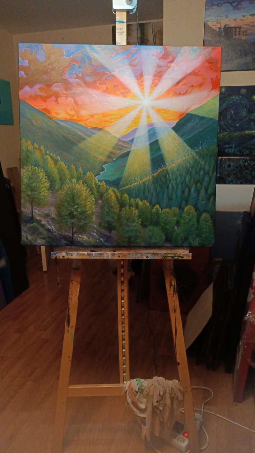 Ich verschmolz Realismus und Surrealismus, um das transzendente Licht sichtbar zu machen, das jede Landschaft durchdringt. Mit Acrylfarben fing ich die lebendige Intensität des Himmels und die Sanftheit der Täler ein und symbolisierte so eine metaphysische Hoffnung. Die leuchtende Energie erhellt den Raum und lädt zum Nachdenken und Staunen über die universelle Schönheit ein.