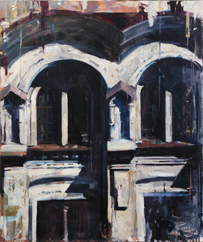 Die Komposition widersetzt sich einer einfachen Darstellung: Die Bögen lösen sich in malerischer Abstraktion auf, während goldene Streifen die Dunkelheit wie Fragmente heiliger Beleuchtung durchbrechen. Der Betrachter wird aufgefordert, die Struktur nicht als festes Gebäude, sondern als Schwelle wahrzunehmen – einen Einstiegspunkt in vielschichtige Zeitlichkeiten, in denen Vergangenheit, Gegenwart und imaginierte Zukunft zusammenlaufen.