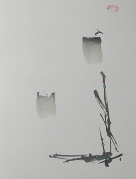 In meiner Kreation habe ich die Fließfähigkeit der Tinte genutzt, um ein Gefühl ätherischer Staunen hervorzurufen. Es ist ein abstraktes Stück, das zur Interpretation einlädt und Emotionen durch minimalistische Gesten auf Papier bringt. Das zarte Spiel zwischen Form und Raum, unterbrochen von Farbtupfern, soll zum Nachdenken und zur Gelassenheit anregen und eine ruhige Energie in Ihren Raum bringen.