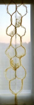 Ich habe diese Textilarbeit mit einer tiefen Reflexion über Verbindung und Kontinuität geschaffen. Die kreisförmigen, miteinander verbundenen Formen aus Wolle stehen für universelle gegenseitige Abhängigkeit. Es besteht ein stillschweigender Dialog zwischen der Zerbrechlichkeit der Fäden und der Stärke der Verbindung, die sie bilden. Es vermittelt eine Botschaft der Einheit und verbindet symbolisch die verschiedenen Lebensbereiche. In Ihrem Zuhause…