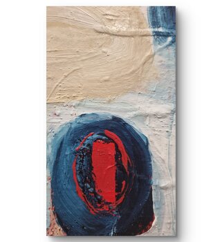 Muted shades of blue and soft, earthy tones create a delicate balance between structure and openness. Geometric forms appear composed yet never rigid — they seem to breathe, subtly shifting and allowing space for stillness. Fine red traces interrupt the calm like quiet pulses of memory and emotion. The work speaks of an order that supports rather than confines, and of a silence in which movement quietly persists.
