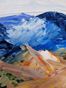 In diesem Gemälde habe ich eine dynamische Landschaft eingefangen, die zwischen Realität und Abstraktion tanzt. Ich habe Palettenmesser verwendet, um eine breite, ausdrucksstarke Szene zu schaffen, und eine kräftige Farbpalette, um die raue Schönheit und die dramatischen Kontraste der Natur hervorzurufen. Dieses Stück verkörpert die Spannung und Harmonie der natürlichen… Welt und lädt den Betrachter ein, über das empfindliche Gleichgewicht unserer Umgebung nachzudenken. Ich hoffe, es bringt ein Gefühl von Energie und Kontemplation in jeden Raum, den es schmückt.