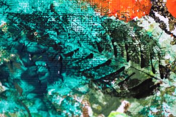 Indem der Künstler Acrylfarbe in leuchtenden Farben verwendet und diese auf sehr spontane und leichte Weise mit dem Finger aufträgt, kontrastiert er Intensität und Weichheit und schafft so eine abstrakte Landschaft, in der jede Farbe frei zu tanzen scheint. Das in einem schwarzen Rahmen gerahmte Gemälde unterstreicht die Lebendigkeit der Farben durch das Spiel mit Kontrasten.