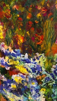 Dieses lebendige und traumhafte Werk enthüllt einen geheimen Weg im Herzen eines üppigen Gartens. Die leuchtenden Blumen in Blau, Gelb und Rosa kontrastieren mit dem diffusen Wald im Hintergrund und verleihen ihm eine Aura von Geheimnis und Tiefe. Das Nebeneinander von hellen Details und dunkleren Bereichen lädt zur Erkundung einer imaginären Landschaft voller Geheimnisse ein.
