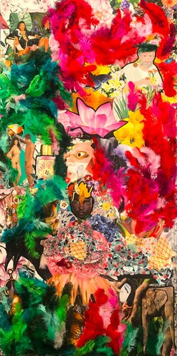 Die Leinwand besteht aus Papiercollagen, Stoffen und Federn zum Thema Natur.