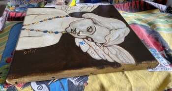 Die zurückhaltende Farbpalette, dominiert von Braun- und Elfenbeintönen, bildet einen markanten Kontrast zur blau-gelben Halskette, den Farben der ukrainischen Flagge –… einem lebendigen Symbol der Solidarität und Unterstützung für die Ukraine. Der zarte Ausdruck des Engels lädt zu Stille und Besinnung ein, wie ein bildhaftes Gebet für den Frieden.