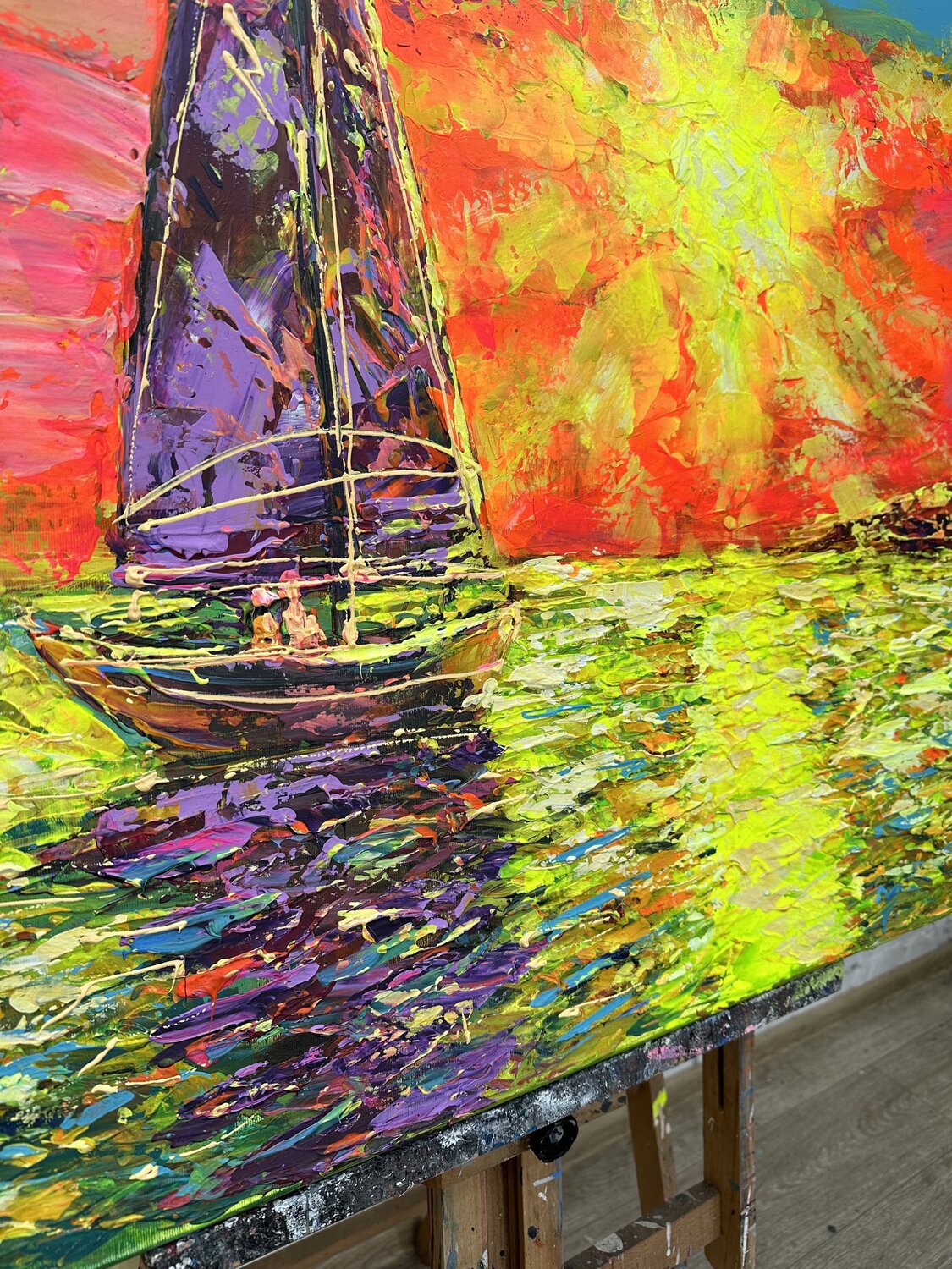 Mit pastoser Technik und kräftigen Strichen habe ich satte Texturen geschaffen, die diese lebendige Meereslandschaft zum Leben… erwecken. Die dicken Ölfarbenschichten spiegeln die Bewegung der Wellen, die Wärme der untergehenden Sonne und die Energie des Meeres wider. Der Kontrast zwischen dem kühlen Blau des Ozeans und der warmen Explosion des Himmels macht dieses Kunstwerk zu einem echten Statement für alle, die von Abenteuer und Flucht träumen.