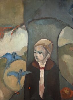 Das Omen zeigt ein Kind, das sich an seinen „Baum der Geheimnisse“ lehnt; zwei blaue Vögel besuchen es, ein Symbol für eine Anwesenheit, etwas kommt, noch unsichtbar;