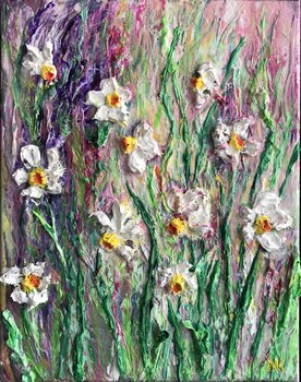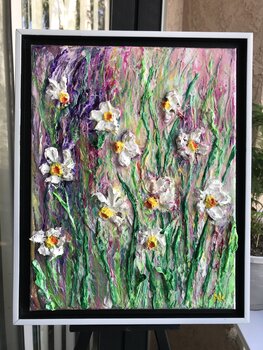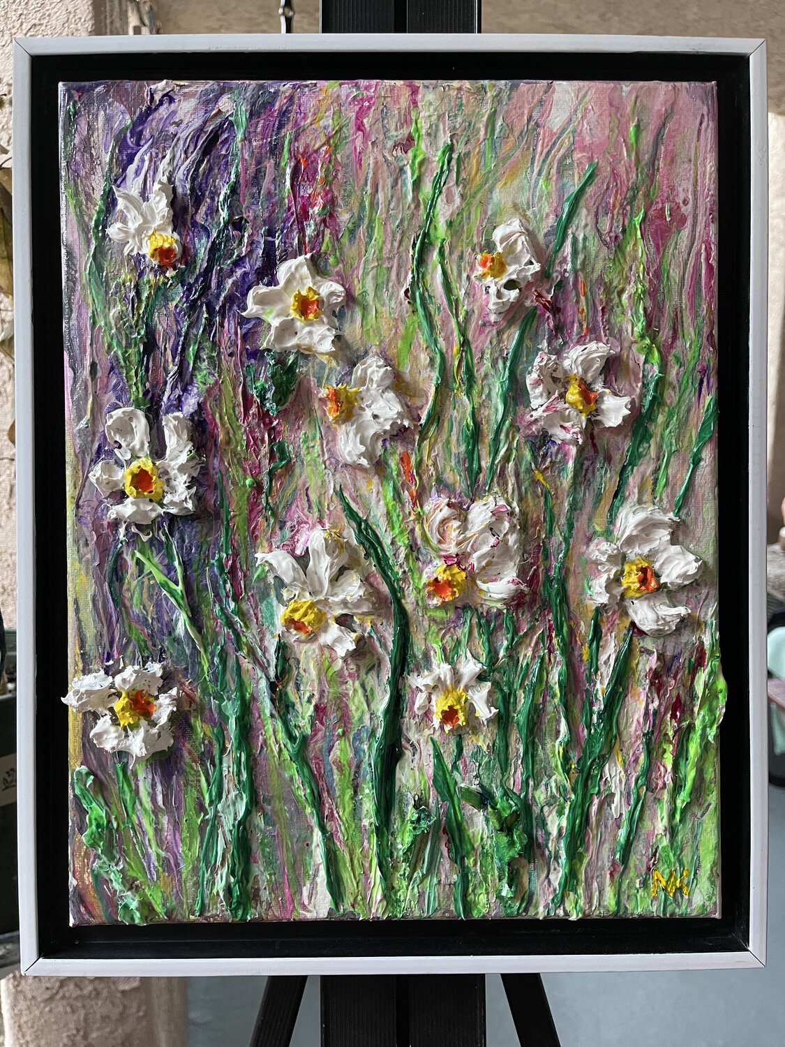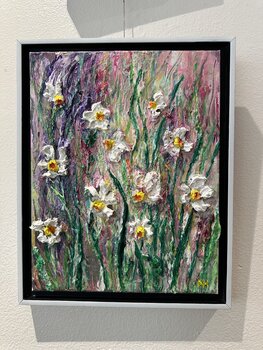 Das Kunstwerk „Narcissus Blues“ wurde von der Natur und Blumen inspiriert, die in dem Gemälde als visuelle Metaphern Gefühle von Schönheit, Freude, Ruhe und stiller Zufriedenheit ausdrücken, die die Stimmung heben und die Herzen mit Glück erfüllen.