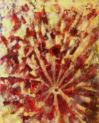 Das Kunstwerk „Shambhala“ ist ein abstraktes Gemälde mit… einer dynamischen Farbexplosion, vorwiegend in Rot- und Gelbtönen sowie mit einem Hauch von Weiß. Die Komposition ist um einen zentralen Brennpunkt herum aufgebaut, von dem aus die Farben nach außen strahlen. Die Pinselführung ist schwer und strukturiert, was dem Werk eine taktile Qualität mit Farbschichten verleiht, die dem visuellen Erlebnis Tiefe verleihen. Gemalt auf einer hochwertigen, in Galeriequalität gespannten Leinwand, kein Rahmen erforderlich. Fertig zum Aufhängen. Auf der Vorderseite signiert. Glänzend und mit UV-, staub- und feuchtigkeitsbeständigen Beschichtungen überzogen.