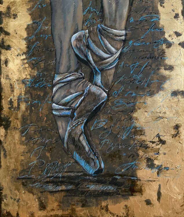 Ein ausdrucksstarkes Ölgemälde, das die grazile Kraft und stille Disziplin des Balletts in einem einzigen Moment einfängt: die Füße einer Ballerina in Hochposition, gehüllt in zarte Spitzenschuhe. Die Darstellung ist reduziert auf das Wesentliche – Füße, Bewegung, Spannung. Der goldene Hintergrund verleiht der Szene eine beinahe sakrale Aura, während Pastelltöne, Kohle und weiße Kreide für ein poetisches Spiel aus Licht und Textur sorgen. Die Mischung… der Materialien erzeugt eine sinnliche Tiefe zwischen Realismus und Abstraktion – eine Hommage an Eleganz, Hingabe und Anmut.