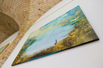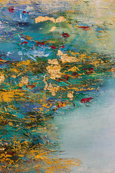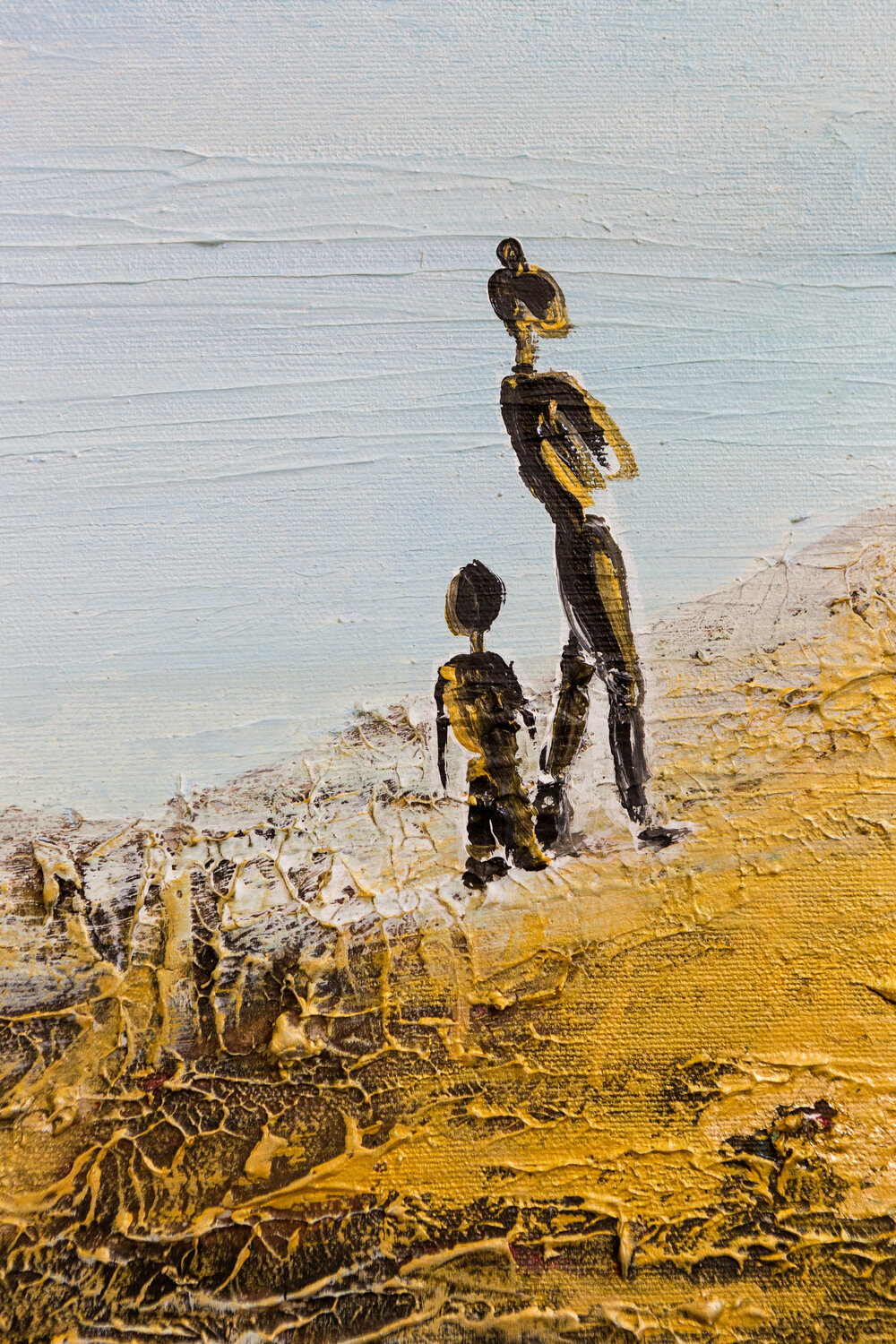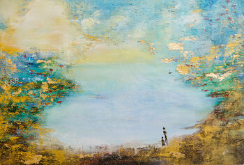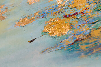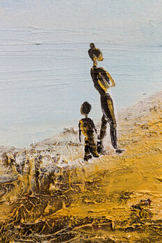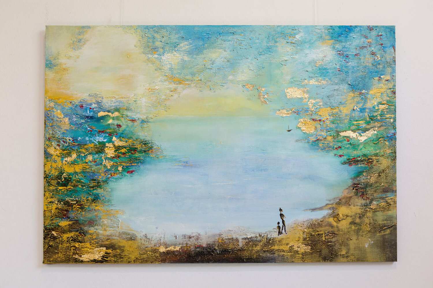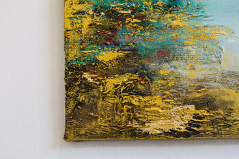 'Haven of Peace' ist ein schweres Bild, voller Strukturpaste und vielen 3 D-Effekten. Nicht nur Goldfarbe, sondern auch Gold Schlagmetall durchdringt das ganze Bild, dass es eine wohlige Wärme und ein warmes Licht umgeben zu scheint. Das ist auch richtig so, denn das Bild ist ein Hafen des Friedens, mit einem Detail von zwei daher schlendernden Personen und einem kleinen, ruhenden Boot in der Ferne. Obwohl es durch die 3 Dimensionalität eher unruhig… wirken sollte, tritt in Wahrheit der Gegeneffekt ein: Ein Ort der Oase ist geboren: Friedlich, ruhig und beruhigend.