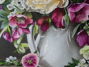 Verschönern Sie Ihre Bauernhaus-Wanddekoration mit diesem atemberaubenden Original-Ölgemälde „Blumen in einer Vase“. Die zarte Kombination aus weißen und violetten Blumen schafft eine wunderschöne und fesselnde Darstellung, die einen Hauch von Natur in Ihren Raum bringt. Dieses einzigartige Kunstwerk auf Leinwand ist perfekt, um jedem Raum in Ihrem Zuhause einen Hauch von Farbe und Eleganz zu verleihen. Werten Sie Ihre Wände mit diesem bezaubernden… Blumengemälde auf, das künstlerischen Charme und zeitlose Anziehungskraft ausstrahlt. Ein Must-have für jeden Kunstliebhaber, der seinen Raum mit Schönheit und Stil erfüllen möchte.