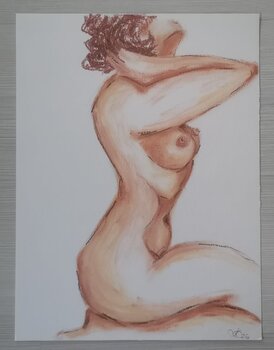 Die warmen, erdigen Töne verstärken die körperliche Präsenz, ohne sie auszustellen. Es entsteht kein klassischer Akt, sondern eine Form der inneren Sammlung.