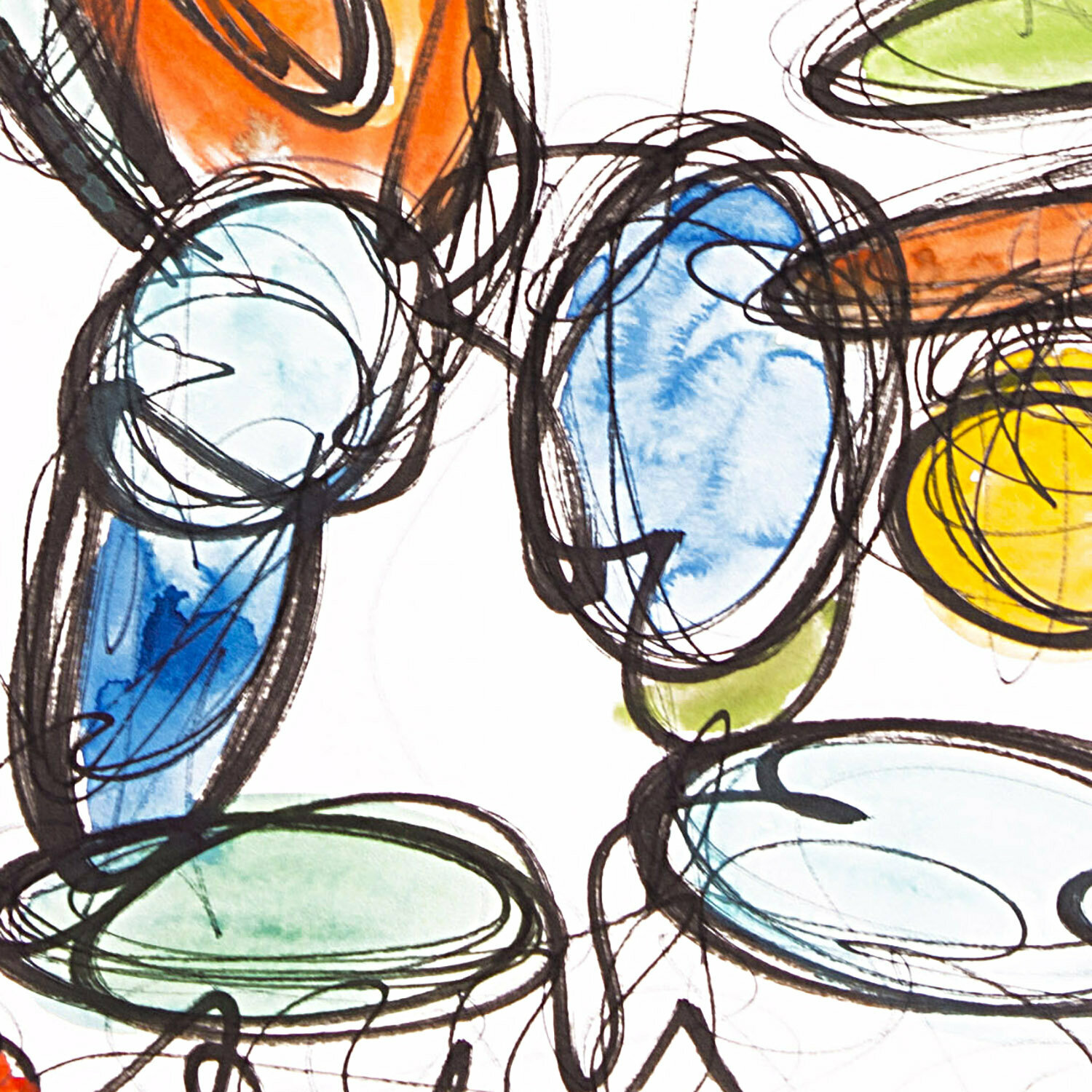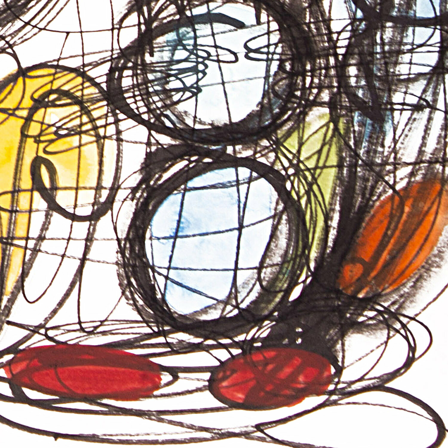 Dieses Kunstwerk, das durch das Zusammenspiel von Acrylfarben, Aquarellfarben und Ölmarkern auf Papier entstanden ist, entführt uns in eine Welt, in der die Essenz des Fliegens eine tiefgreifende Bedeutung hat. Welche Melancholie würde unsere Welt umhüllen, wenn die Flügel des Vogels still bleiben würden, ohne ihren ätherischen Tanz über den Himmel? Doch innerhalb dieses Wandteppichs der Fantasie entfaltet sich eine Erzählung, in der Vögel sich mit… einer Sprache unterhalten, die aus der eleganten Krümmung ihrer runden Flügel gewoben ist. Rätselhafte schwarze Linien zeichnen die Konturen ihrer herrlichen Formen nach, jeder Farbton ist eine Symphonie pulsierenden Lebens.