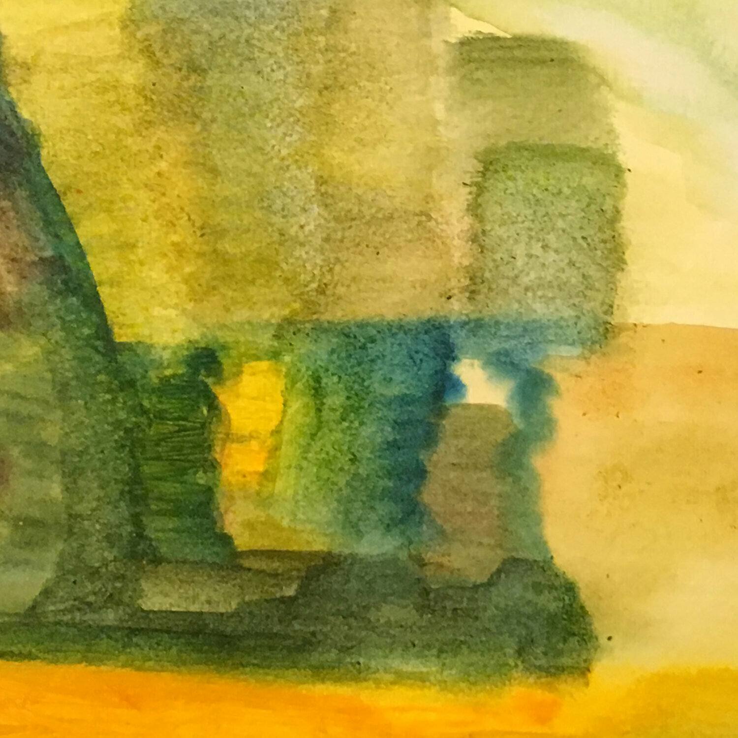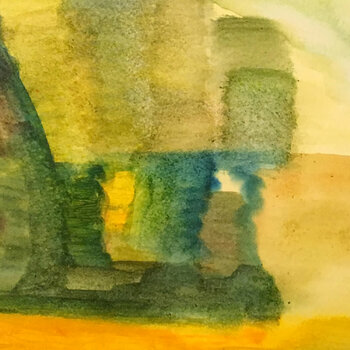 In dieser Komposition erstreckt sich oben ein blauer Himmel, während sich unten ein grün-gelbes Land ausbreitet. Auf der linken Seite bricht ein feuriger Ausbruch aus, der ein dynamisches Element einleitet. Die gesamte Szene ist in Wärme getaucht, da strahlende Gelbtöne die Anwesenheit einer riesigen Sonne suggerieren, die das Land umhüllt und ein lebendiges und lebendiges Bild erzeugt.
