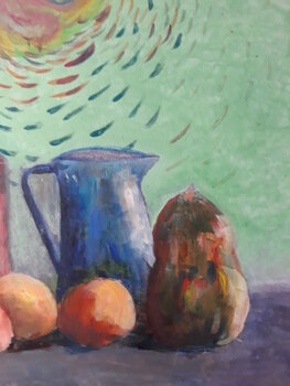Mit lebendigen, rhythmischen Pinselstrichen umgebe ich klassische Elemente – eine Flasche, einen Krug und Früchte – mit einem leuchtenden Wirbelwind, der die Ruhe des traditionellen… Stilllebens zerreißt. Der Hintergrund ist kein leerer Raum, sondern ein Kräftefeld, das die Szene in eine beinahe traumhafte Atmosphäre hüllt.