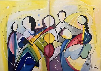 In diesem Ölgemälde verflechte ich abstrakte und figurative Elemente mit einem Hauch futuristischer Vision. Die Kombination aus lebendigen Farben und dynamischen Formen schafft eine Szenerie, die sowohl energetisch als auch emotional tiefgründig ist. Diese Komposition symbolisiert die Verbindung und die fließenden Energien zwischen den Menschen, betont durch die verschlungenen Linien und schwebenden Kreise.… Es lädt den Betrachter ein, über die zwischenmenschlichen Beziehungen und die daraus entstehenden Emotionen zu reflektieren. Dieses Kunstwerk bringt eine kraftvolle, positive Energie in jedes Heim, angereichert mit einem Anflug von Zukunftsoptimismus.