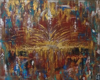 Dieses Gemälde entstand aus meiner momentanen Inspiration, als ich die Mondfinsternis vom 7. September betrachtete, die flüchtige Begegnung zwischen Sonne und Mond, die gesagten und die ungesagten Dinge, einen rot gefärbten Himmel, die Sonne, die versucht, sich zu verabschieden, und das Leben um uns herum, das in intensiven Momenten fließt. Diese Momente werden durch das silberne Blatt und die seitlichen Spritzer von Hellblau und Türkis dargestellt.