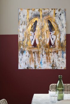 In diesem Gemälde wollte ich die zerbrechliche Schönheit der Seele einfangen, die sich in einer Welt zwischen Traum und Wirklichkeit widerspiegelt. Die Verwendung von Zement und Sand erzeugt eine raue Textur, die mit den zarten Figuren kontrastiert, während das Blattsilber verborgene Emotionen zum Vorschein bringt. Dieses Werk vermittelt eine intensive innere Dualität, perfekt für alle, die ihrem Zuhause ein Gefühl von Geheimnis und Tiefe verleihen… möchten.