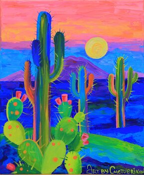 In diesem Acrylgemälde habe ich die lebhaften Kontraste und das Zusammenspiel der Farben genutzt, um die heitere und ungezähmte Schönheit einer Wüste bei Sonnenuntergang einzufangen. Die strahlenden Farbtöne des Himmels, die von warmen Rosatönen zu tiefen Blautönen übergehen, symbolisieren die ständigen Veränderungen des Lebens, während die standhaften Kakteen Widerstandskraft und Ausdauer widerspiegeln. Dieses Werk lädt den Betrachter ein, Harmonie… in den Kontrasten der Natur zu finden, und dient als Erinnerung an die beständige Schönheit und Stärke, die uns umgibt.