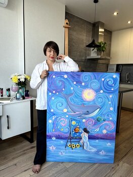 In diesem Stück habe ich meiner Bewunderung für die grenzenlosen Welten der Vorstellungskraft freien Lauf gelassen, die Geist und Natur gemeinsam erkunden können. Als ich Acryl auf Leinwand brachte, stellte ich eine wunderliche Interaktion zwischen einem Schöpfer und einer heiteren, surrealen Welt dar. Ein riesiger, wirbelnder Nachthimmel verschmilzt mit dem tiefen Ozean, wo Papierboote ruhig dahinsegeln und ein sanfter Wal mit himmlischer Anmut… schwimmt. Dieses Kunstwerk strahlt eine traumhafte Ruhe aus und lädt Sie ein, über die schöne Fluidität zwischen Schöpfung und Schöpfer, Realität und Träumen nachzudenken. Es ist eine visuelle Symphonie, die im Herzen jedes Betrachters Frieden und Staunen hervorrufen soll.