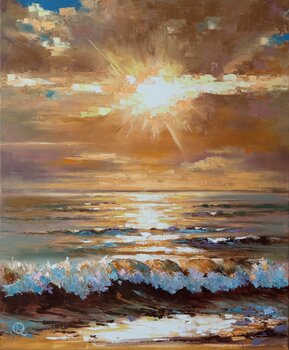 „Breath of Light“ fängt den Moment ein, in dem die Sonne den Horizont küsst und die Welt in goldenes Licht taucht. Warme Strahlen durchdringen die Wolken, tanzen auf den Wellenkämmen und lassen das Meer Licht und Wärme atmen. Dieses Gemälde strahlt Harmonie und Ewigkeit aus und erinnert uns daran, dass jeder Sonnenuntergang ein kleines Wunder ist.